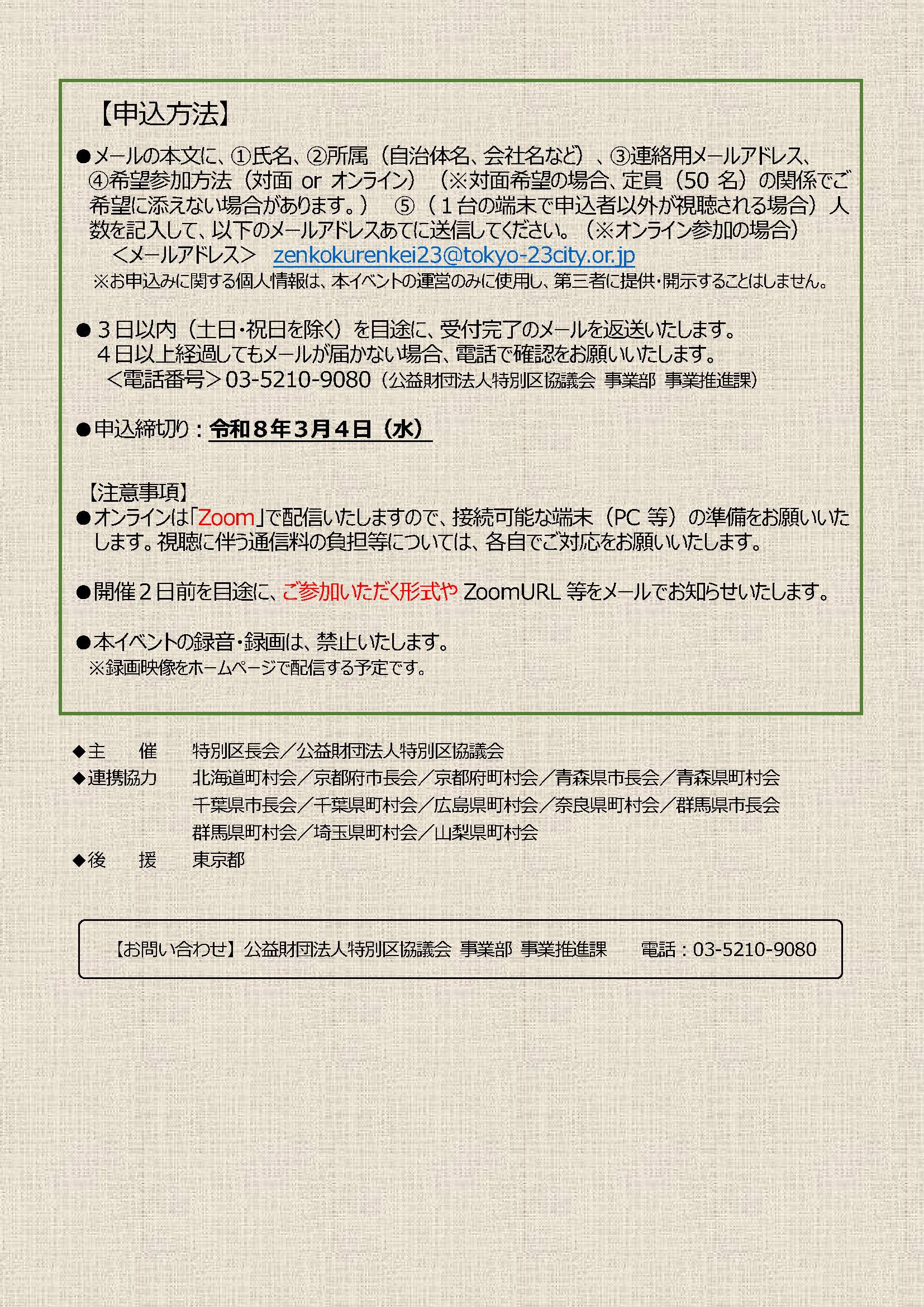 <電話番号>03-5210-9080(公益財団法人特別区協議会 事業部 事業推進課)