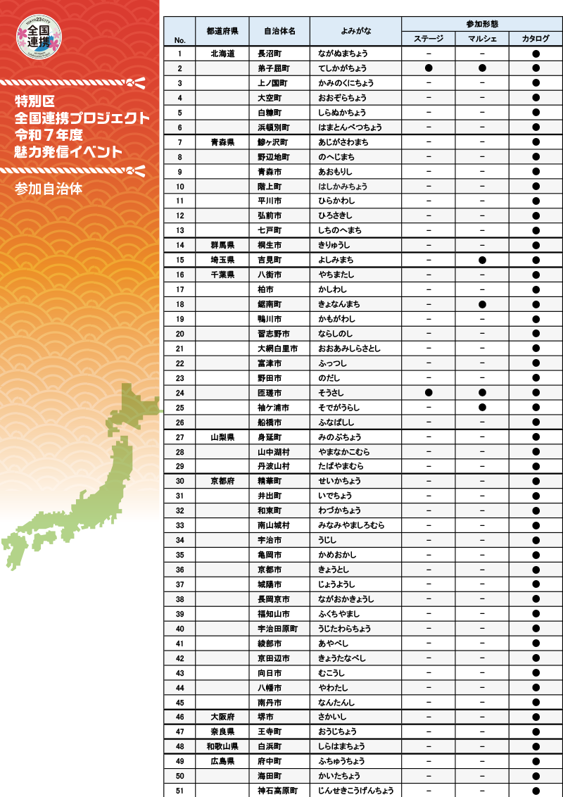 このたび、本プロジェクトの一環として、各地域の自治体の魅力や特色を広く発信する場として、魅力発信イベントを開催します。今年度は、全国の賛同自治体のパンフレットの配布やステージイベント、物産展を行います。ぜひご来場ください。